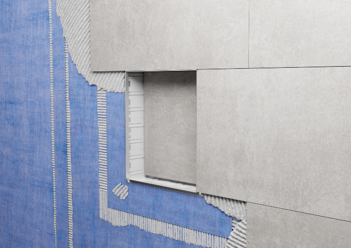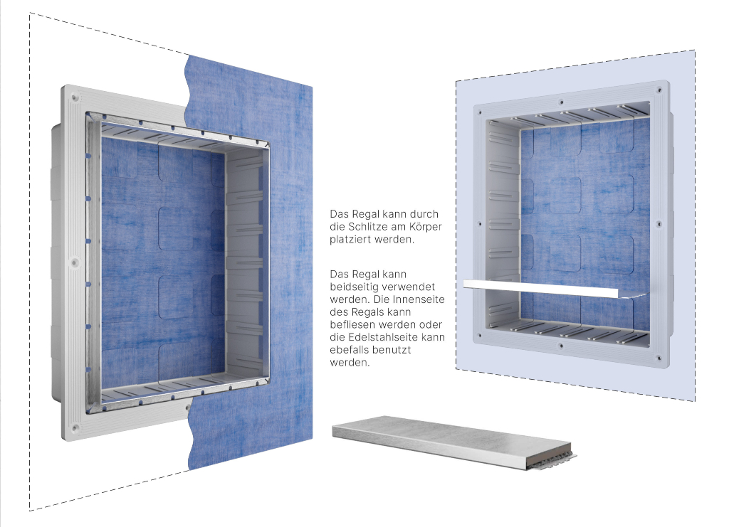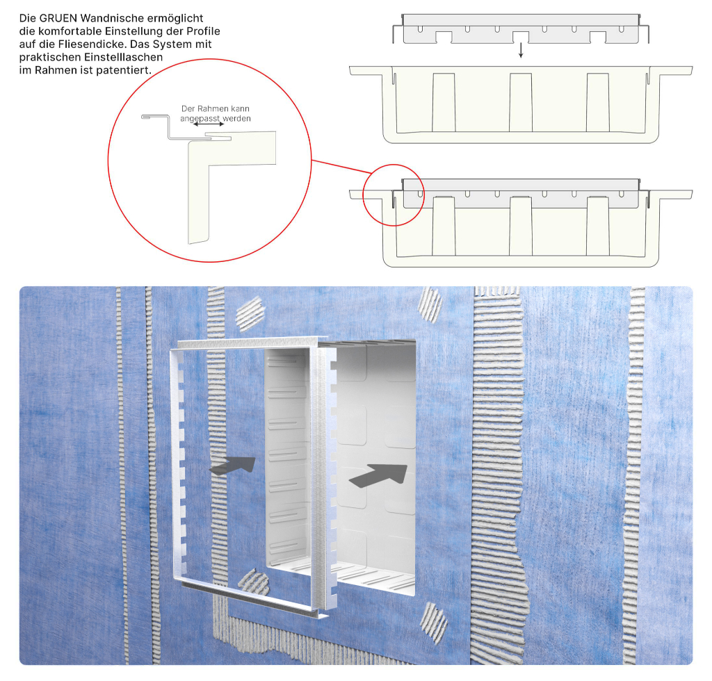 Die GRUEN Wandnische für den Duschbereich ist fertig zum Verfliesen. Mit ihrer werkseitig verbundenen Dichtmanschette kann sie schnell und sicher an die Verbundabdichtung angeschlossen werden. Die hochwertigen, integrierten Abschlussprofile überzeugen durch eine Kombination aus Funktionalität und Design. Die Profile sind zugeschnitten und werden einfach aufgesteckt. Das spart Zeit. Die Verbindung ist patentiert und ermöglicht ebenfalls die Einstellung auf die Fliesendicke. Die Profile schützen die Fliesenkanten wirksam vor Beschädigungen und sorgen für einen eleganten Akzent.
