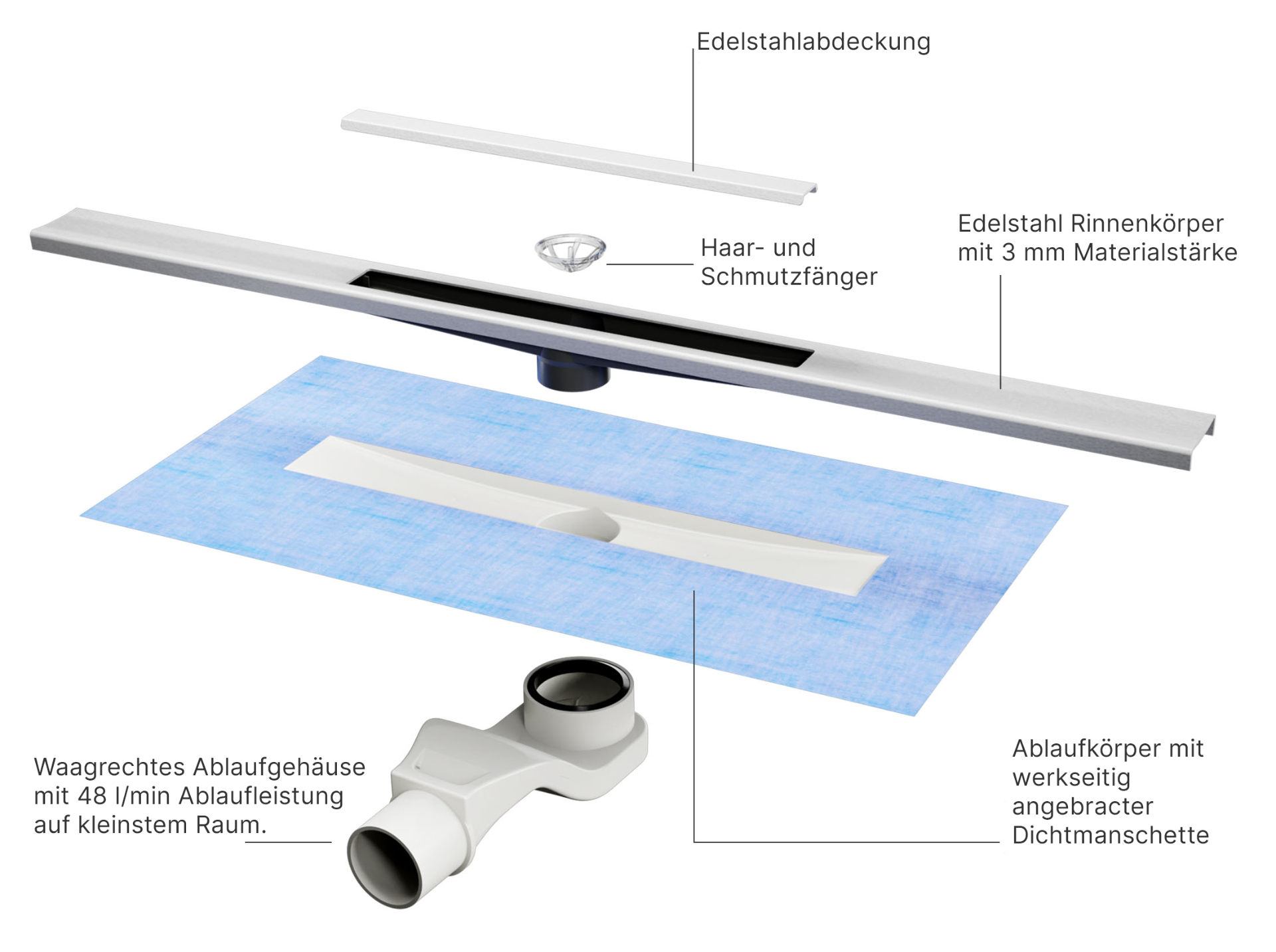 Waagrechtes Ablaufgehäuse mit sehr hoher Ablaufleistung von 48 l/min auf kleinstem Raum
