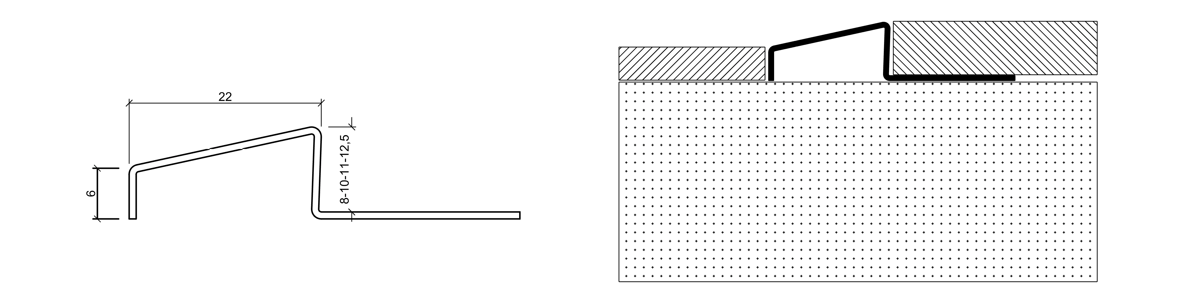 PK70 schafft einen stufenlosen Übergang von einer Fliese (in den Höhen 8 mm, 10 mm, 11 mm und 12,5 mm) zu einem niedrigeren Bodenbelag. Durch die einseitige Flügelstruktur ist PK70 leicht unter der Abschlussfliese einzubringen. Der niedrigere Belag wird vor dem Profil mit der verbleibenden Höhe von 6 mm angeschlossen. Es entsteht ein ansprechender, klarer Übergang zwischen den Oberflächen. Wir fertigen PK 70 in Edelstahl gebürstet und glänzend.