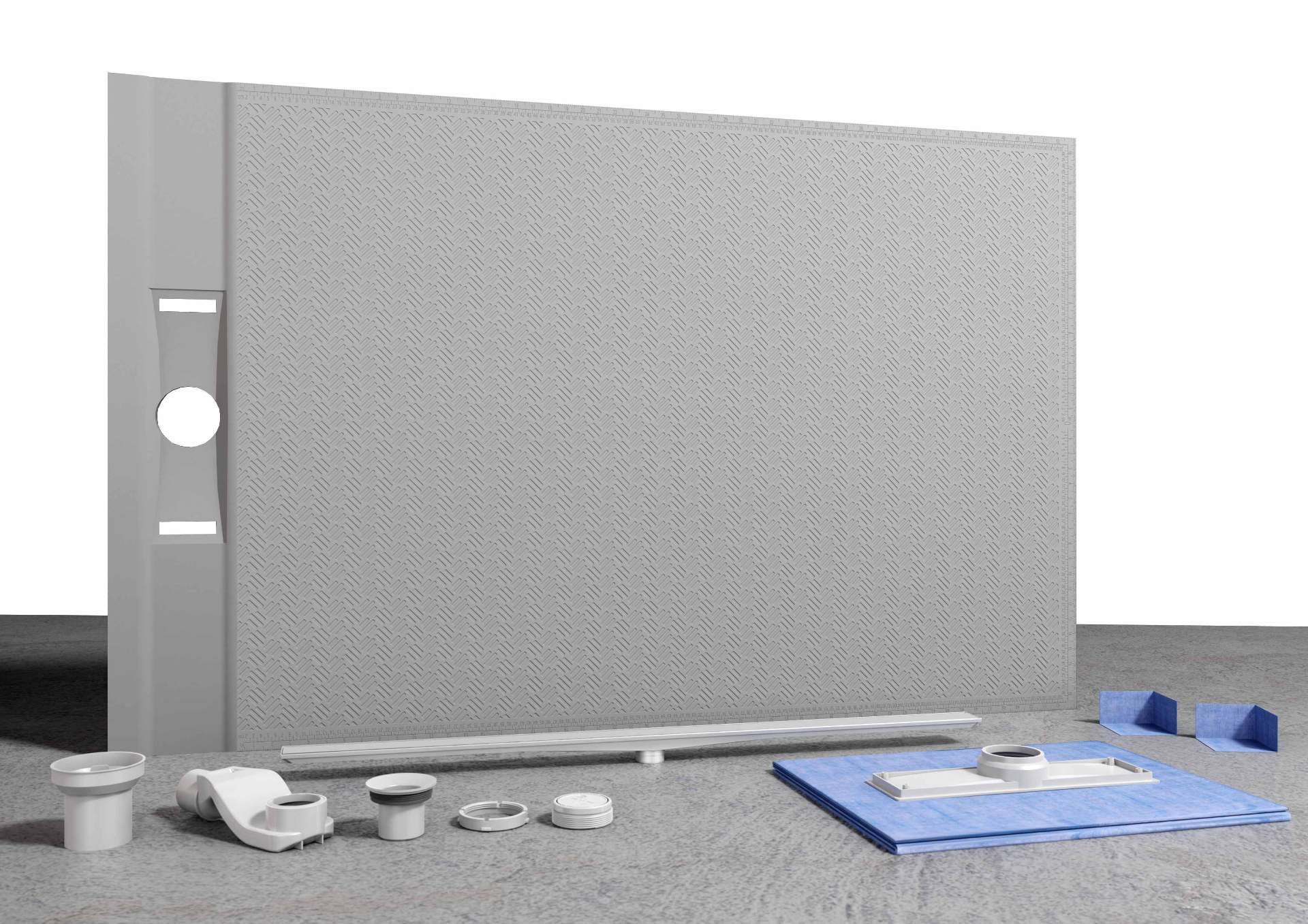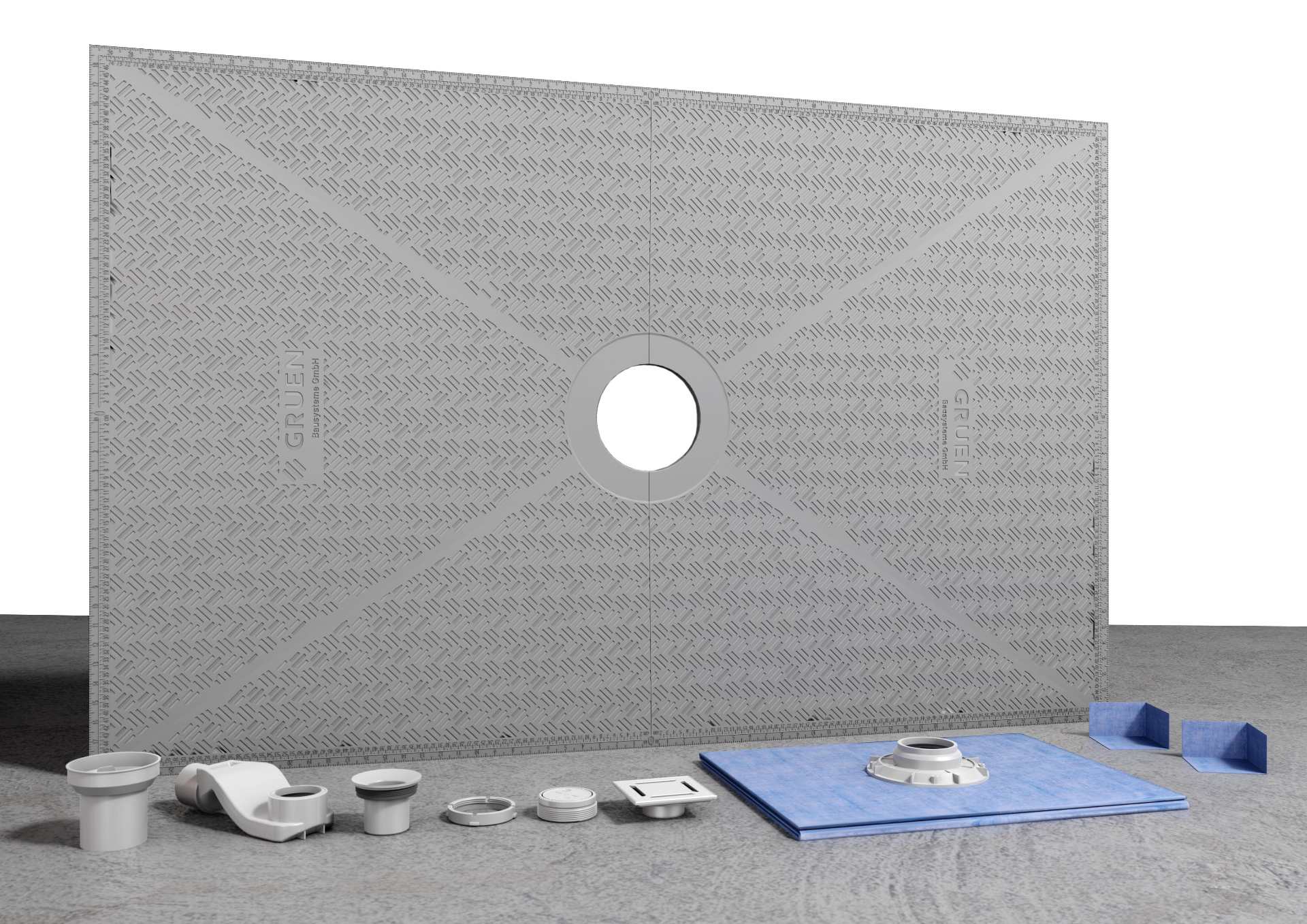 Das befliesbare Duschelement von GRUEN ist ein schneidbares Gefälleboard mit Punktablauf und bis in den Wandbereich überlappender Abdichtbahn zur Erstellung Bodenebener Duschen. Die vier dreieckigen Flächen des Elements sind zum Ablauf geneigt. Es ist kompatibel mit den GRUEN Punktabläufen, die jeweils im Set enthalten sind. Das Duschelement ist konsequent so konzipiert, dass es sehr einfach, schnell und sicher installiert werden kann: Anhand des aufgebrachten Gitterrasters ist es komfortabel und genau schneidbar. Es kann dank seiner praktischen Anschlussteile problemlos Höhenunterschiede ausgleichen und an nahezu alle Abflusssysteme angebracht werden. Die Dichtungsbahn wird mit einem Verschlussring sicher verbunden. Sie ist an den Seiten überhängend und schafft bereits die sichere Abdichtung bis in den Wandbereich. Erst hier ist die nächste Bahn anzuschließen. Der Anpassung an Fliesenbild und -höhe dient ein verstellbarere Verschraubungsring. Mit dem befliesbaren Duschelement mit Punktentwässerung von GRUEN erstellen Sie somit perfekte Duschflächen.