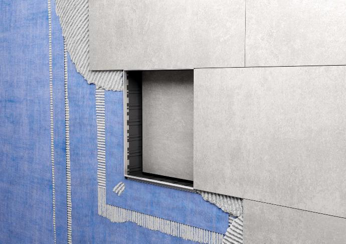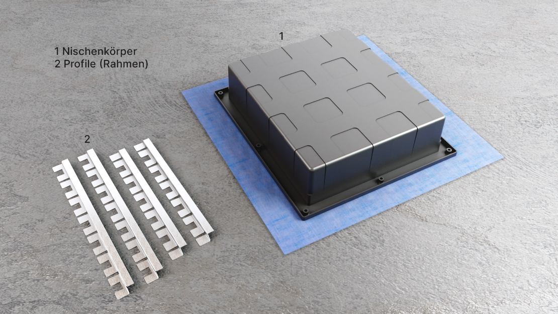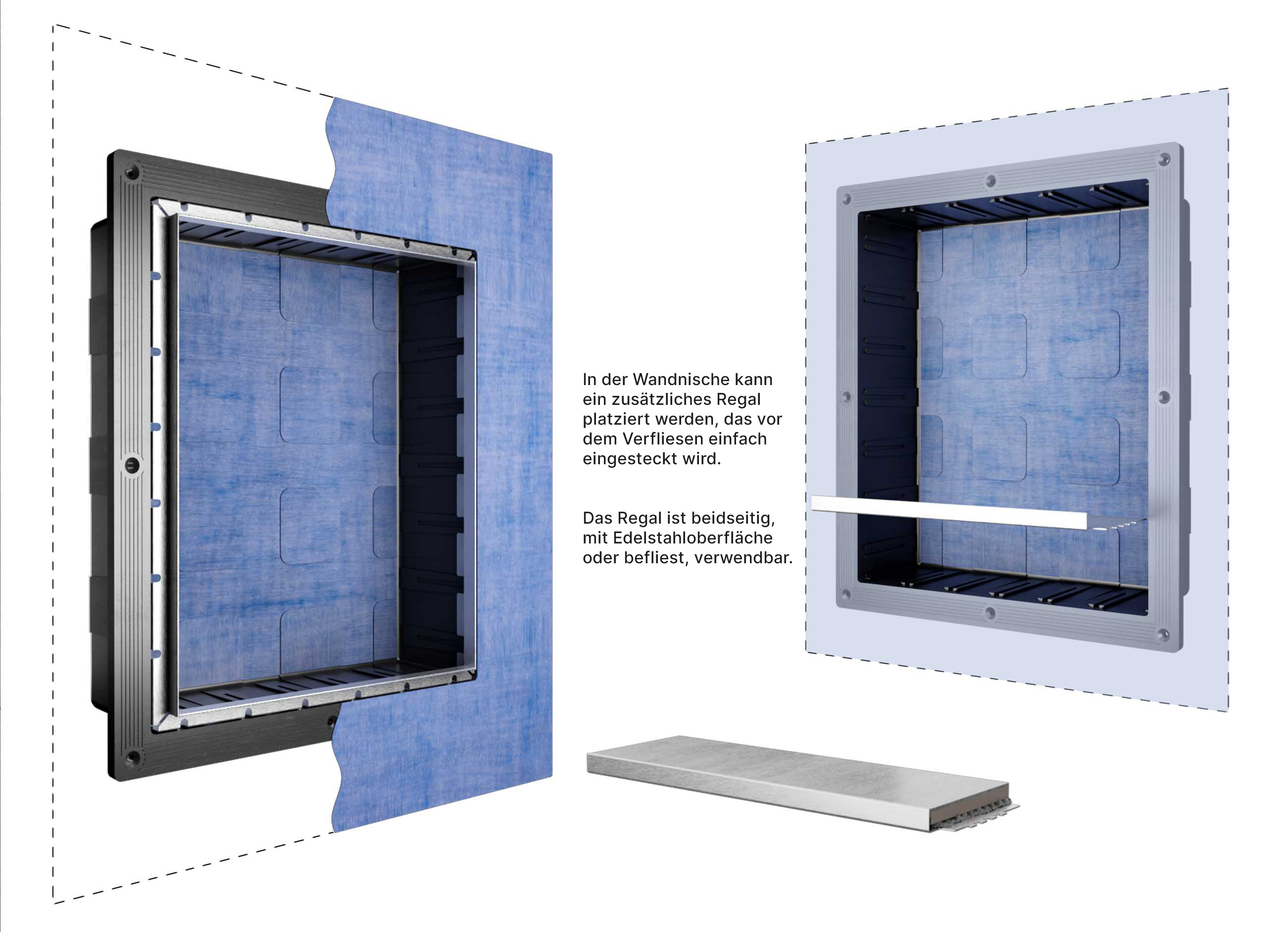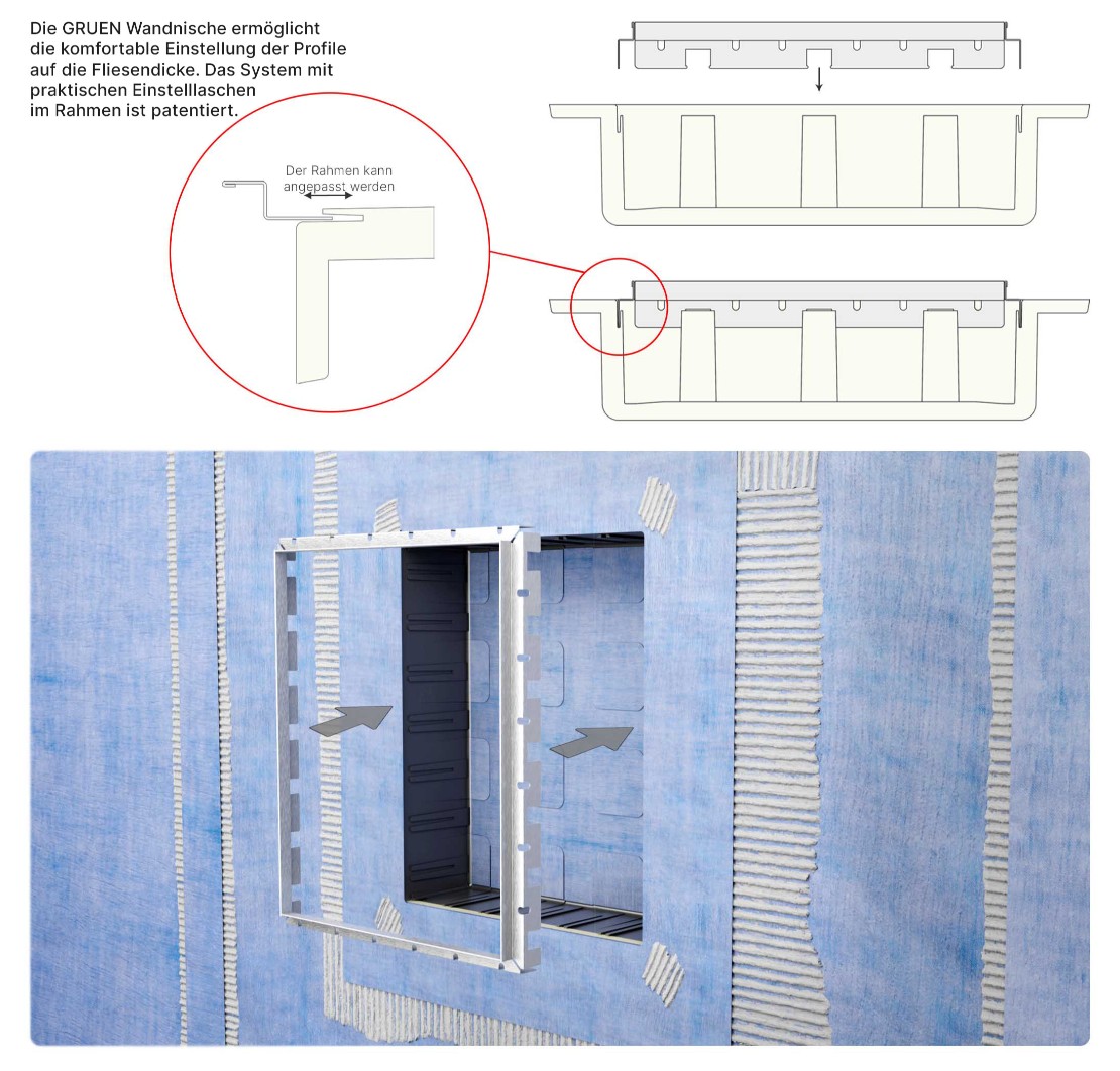 Die GRUEN Wandnische für den Duschbereich ist fertig zum Verfliesen. Mit ihrer werkseitig verbundenen Dichtmanschette kann sie schnell und sicher an die Verbundabdichtung angeschlossen werden. Die hochwertigen, integrierten Abschlussprofile überzeugen durch eine Kombination aus Funktionalität und Design. Die Profile sind zugeschnitten und werden einfach aufgesteckt. Das spart Zeit. Die Verbindung ist patentiert und ermöglicht ebenfalls die Einstellung auf die Fliesendicke. Die Profile schützen die Fliesenkanten wirksam vor Beschädigungen und sorgen für einen eleganten Akzent.