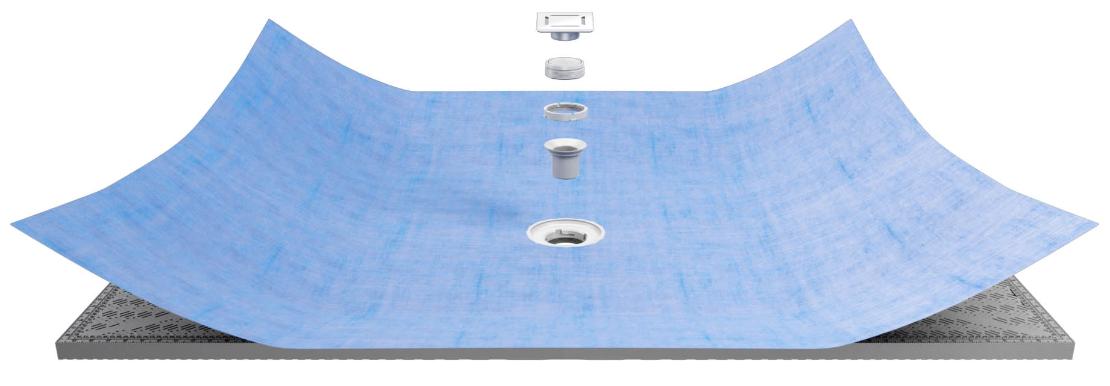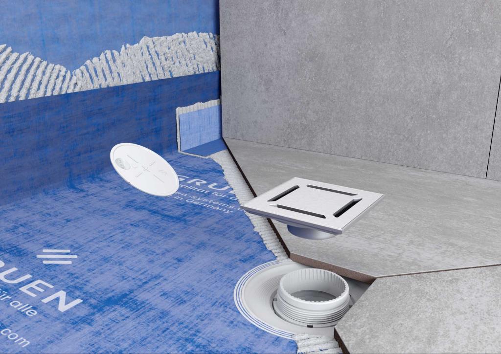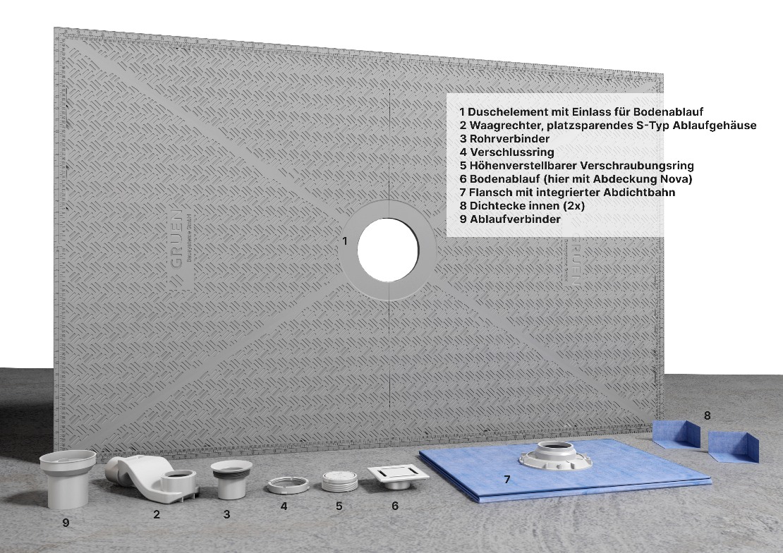 Das befliesbare Duschelement von GRUEN ist ein schneidbares Gefälleboard mit Punktablauf und bis in den Wandbereich überlappender Abdichtbahn zur Erstellung Bodenebener Duschen. Die vier dreieckigen Flächen des Elements sind zum Ablauf geneigt. Es ist kompatibel mit den GRUEN Punktabläufen, die jeweils im Set enthalten sind. Das Duschelement ist konsequent so konzipiert, dass es sehr einfach, schnell und sicher installiert werden kann: Anhand des aufgebrachten Gitterrasters ist es komfortabel und genau schneidbar. Es kann dank seiner praktischen Anschlussteile problemlos Höhenunterschiede ausgleichen und an nahezu alle Abflusssysteme angebracht werden. Die Dichtungsbahn wird mit einem Verschlussring sicher verbunden. Sie ist an den Seiten überhängend und schafft bereits die sichere Abdichtung bis in den Wandbereich. Erst hier ist die nächste Bahn anzuschließen. Der Anpassung an Fliesenbild und -höhe dient ein verstellbarere Verschraubungsring. Mit dem befliesbaren Duschelement mit Punktentwässerung von GRUEN erstellen Sie somit perfekte Duschflächen.