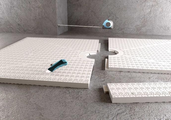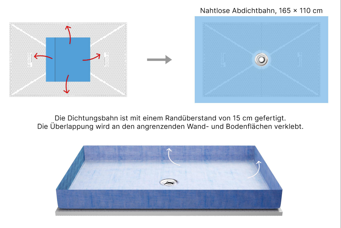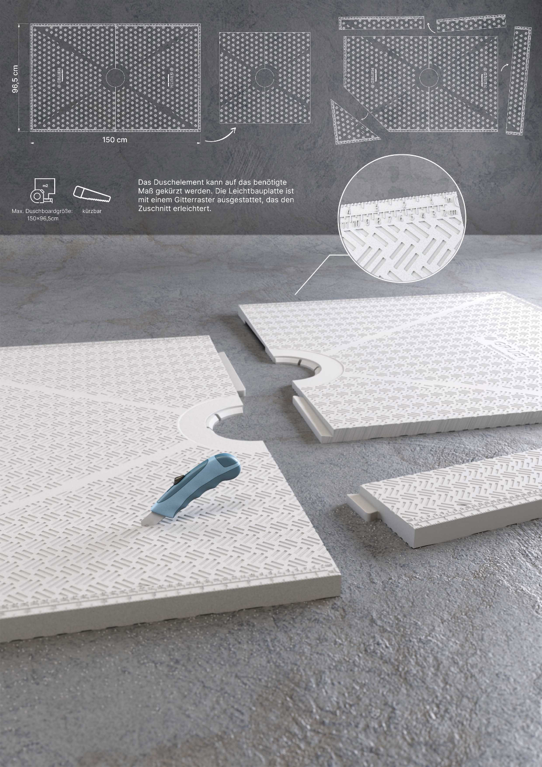 Messen Sie die Duschfläche aus und schneiden Sie das Duschelement passend zu. Ein Kürzen der Dichtungsbahn ist nicht erforderlich.